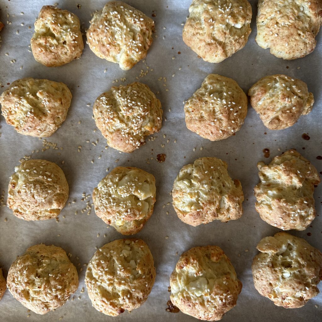 Πλάθουμε σε 20 μπαλάκια, πασπαλίζουμε με σουσάμι και ψήνουμε σε προθερμασμένο φούρνο στους 180 βαθμούς Κελσίου μέχρι να ροδοκοκκινίσουν.